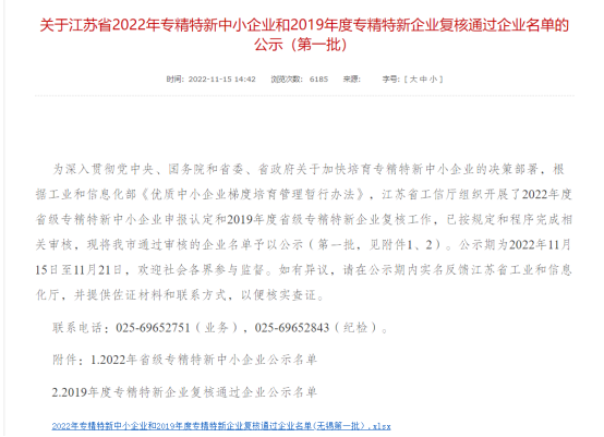 近日省工信部公示江蘇省2022年專精特新中小企業(yè)和2019年度專精特新企業(yè)復核通過企業(yè)名單博路威入選江蘇省2022年專精特新中小企業(yè)公示名單